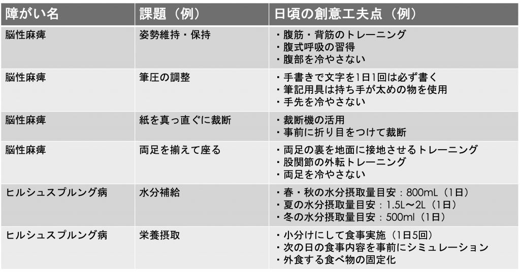 脳性麻痺・ヒルシュスプルング病で工夫していること(例)